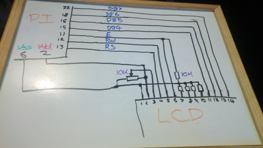 I'm using a total of 7 I/O pins, E (enable), RS (switch between command and character mode), RW (I'm not actually using this right now) , and then DB4 through DB7 which are the 4 input bits (they are the higher nibble of the full 8 bits). This is the circuit :